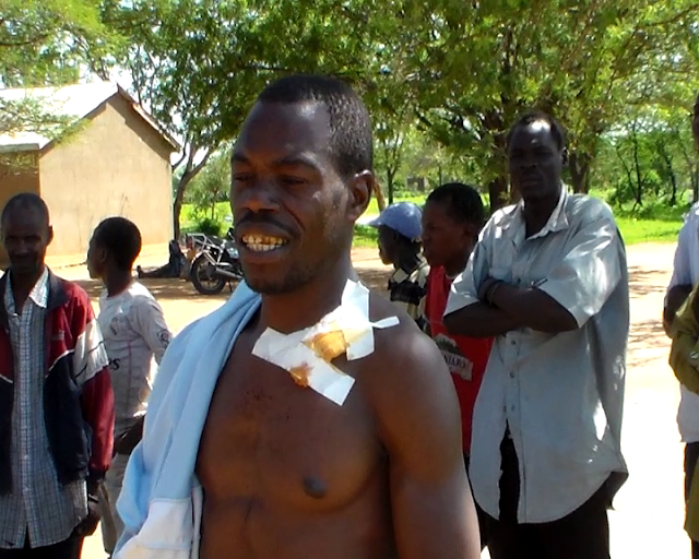 Mmoja wa majeruhi aliyekatwa panga, katika vurugu za wafuasi wa Chama cha Mapinduzi CCM na CHADEMA Wilayani Bariadi Mkoani Simiyu, katika kata ya Malambo kijiji cha Ngashanda, usiku wa kuamkia leo. Katika vurugu hizo wananchi katika kijiji hicho walieleza kuwa zilikuwa zikiongozwa na Mke wa Chenge Suzy Chenge.